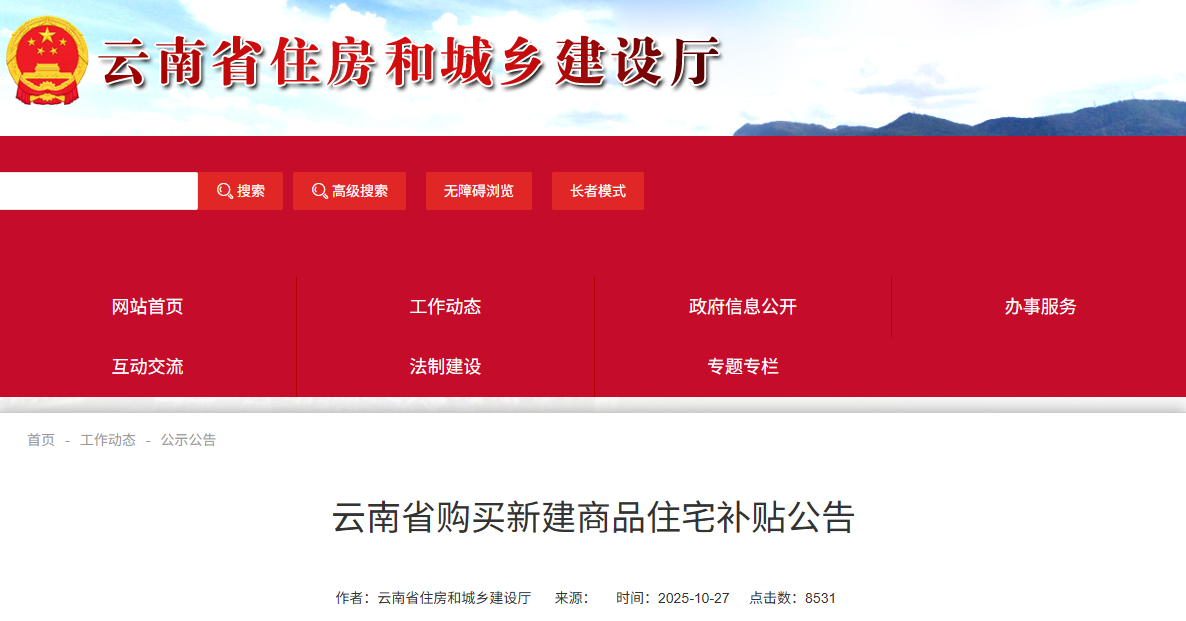 为促进全省房地产市场平稳健康发展,云南省决定以彩云住房消费券方式开展2025年云南省购买新建商品住宅补贴。现将有关事项公告如下。